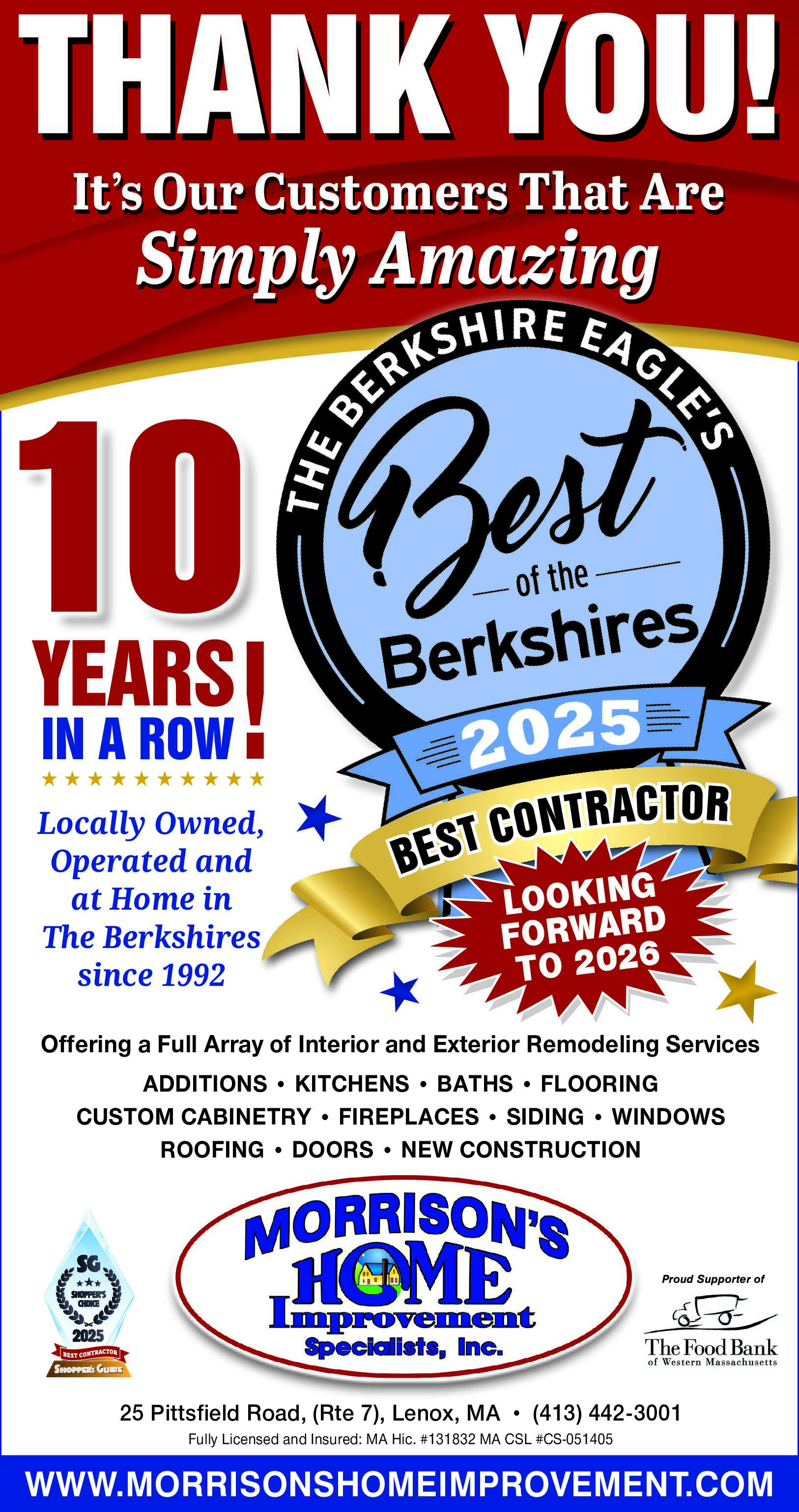 We have been in business since 1992 and have been rated the best contractor nine years in a row, so you can rest easy when you choose Morrison's Home Improvement. Our extensive kitchen and bath showroom will help you visualize your new room before construction even begins. We're also licensed and insured to give you peace of mind. Concerned about paying for everything up front? Just ask about our financing plans. Call us today at 413-442-3001 or send an email to morrisonsimprove@yahoo.com to get a free estimate for your home improvement project.